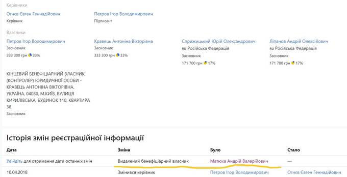 А ось витяг з українського державного реєстру юридичних осіб, який повідомляє, що в одній із фірм, що належать Андрію Матюсі до недавнього часу, є російські співзасновники. Це ТОВ «Доріда Ріелті», в якому його партнерами були росіяни Юрій Спріжицький та Ліпанов Андрій. Станом на сьогодні Андрій Матюха із засновників вийшов, але наскільки ця дія є реальною, а не формальною – велике питання.