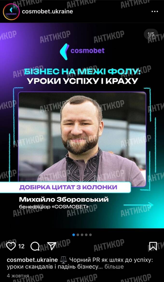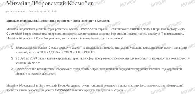 Онлайн-казино Cosmobet офіційно очолює статист, який у вільний час захоплюється глобалізмом та марафонським бігом. Це могло б виглядати комічно, якби справжні власники цієї платформи не намагалися переконати громадськість, що виходець із села Красилівка Івано-Франківської області Михайло Зборовський став бенефіціаром казино зі статутним капіталом у 30 мільйонів гривень, не маючи ні досвіду, ні відповідних фінансових ресурсів.