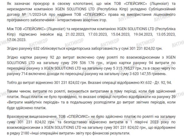 Ця ж компанія згадується у матеріалах справи щодо онлайн-казино «Космолот», яке підозрюють у несплаті податків на мільярд гривень. Слідчі повідомляють, що у 2023 році казино мало договір з кіпрською компанію XGen Solutions LTD на використання ліцензійного програмного забезпечення. З’ясувалось, що «Космолот» нібито заборгував кіпрській фірмі близько 300 мільйонів гривень, які для податкової були вказані як роялті. Казино зазначало, що платило компанії з Кіпру за софт, але насправді ніяких платежів проведено не було. Редакція писала про це, розповідаючи про справжнього власника «Космолоту» – громадянина Росії Сергія Токарєва.