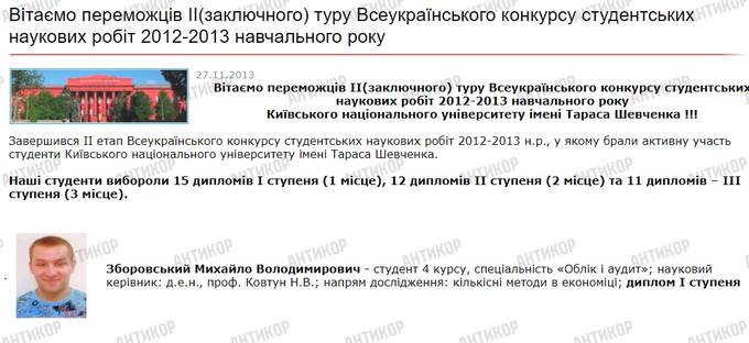 Роком пізніше, вже на четвертому курсі, він отримав диплом першого ступеня на Всеукраїнському конкурсі студентських наукових робіт. Напрям його дослідження стосувався кількісних методів в економіці.