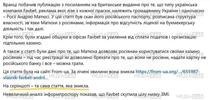 Замість цього в 2024–2025 роках йшла масова зачистка публікацій про російський паспорт Матюхи, роботу FavBet в РФ і зв’язки з «Лужниківськими». Зникали не тільки розслідування великих медіа, але й фотографії паспорта, матеріали про «Доріду Ріелті» та переписка техпідтримки з росіянами. На зміну їм у публічній повістці з’являлися новини про благодійні акції FavBet Foundation — допомогу армії, госпіталям (включаючи «Охматдит»), спортивним проектам.