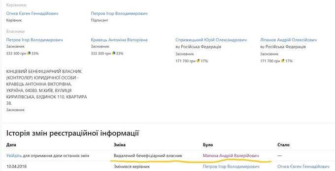 Втім, Матюха з числа бенефіціарів вийшов, але формально або реально – невідомо. У будь-якому випадку, це сталося у 2018 році, коли вже давно був анексований Крим і окупований Донбас.