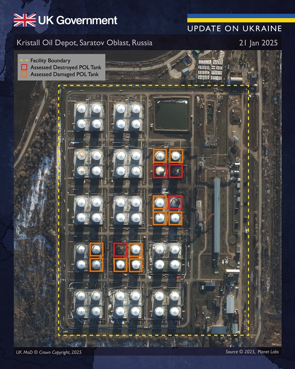 Аналіз знімків від 21 січня засвідчив знищення чотирьох цистерн із ПММ, ще пошкодження десяти.
