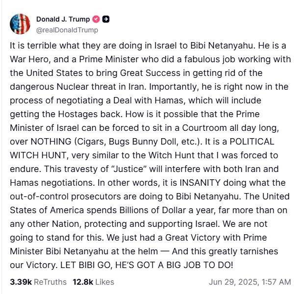 Президент США Дональд Трамп розкритикував судовий процес над прем’єр-міністром Ізраїлю Біньяміном Нетаньягу та додав, що вважає останнього “героєм війни”. Про це свідчить повідомлення американського лідера опубліковане в його соцмережі Truth в неділю, 29 червня.