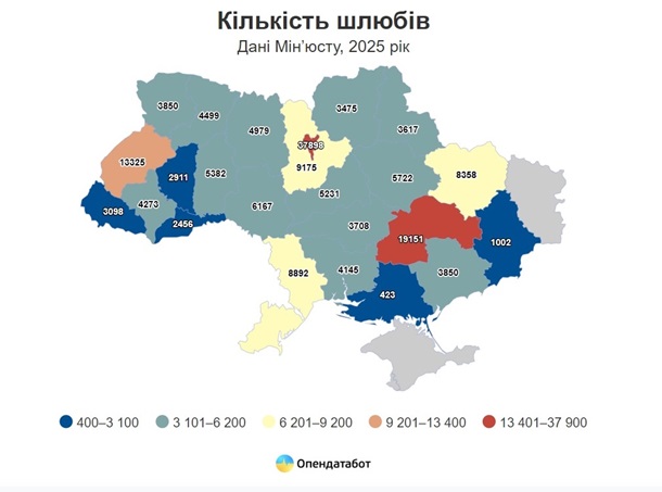 На другому місці – Дніпропетровщина з 19 151 шлюбом. Ще 13 325 пар одружилися на Львівщині. В обох регіонах шлюбів побільшало на третину у порівнянні з 2024 роком.